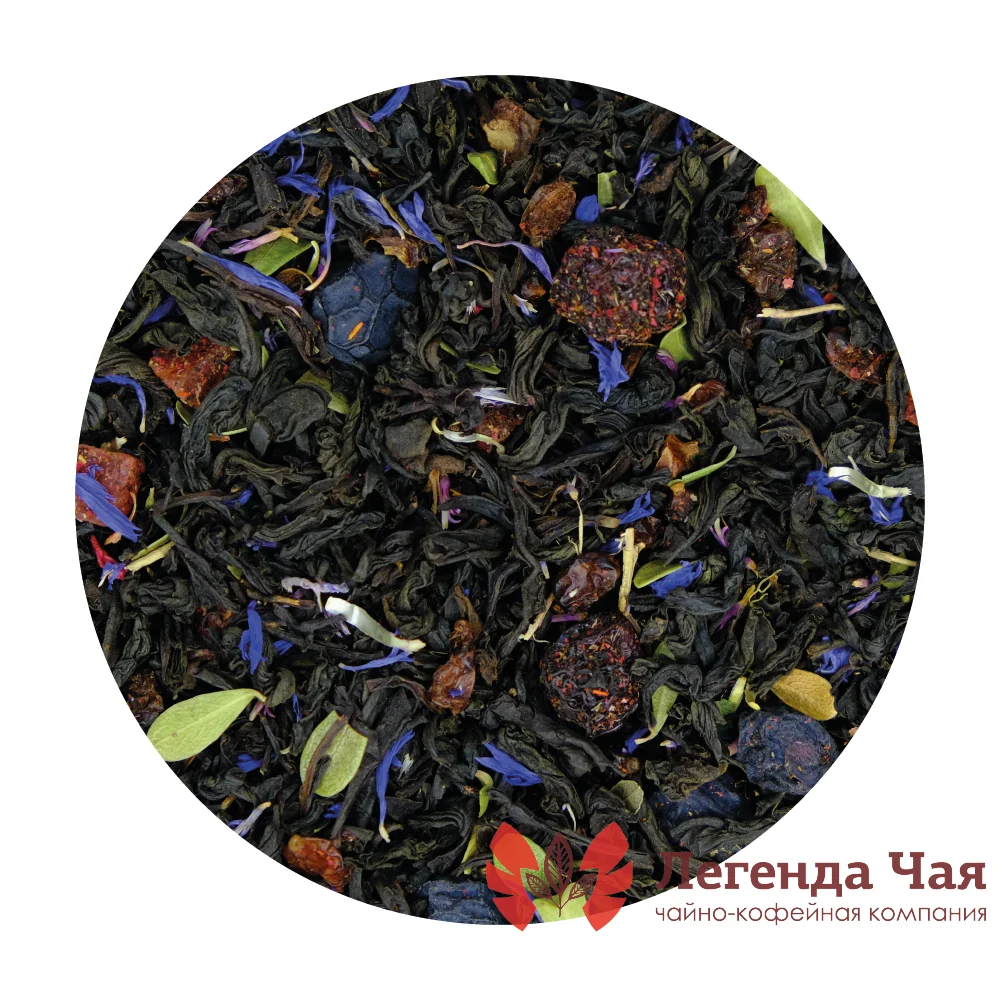 Кенийский черный чай, вишня сушеная, клюква вяленая, лепестки василька, листья толокнянки, цукаты папайи