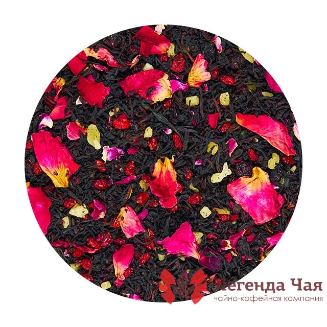 Кенийский черный чай, барбарис красный, вишня сушеная, лепестки розы, мелкие лепестки розы, цукаты ананаса светлые, цукаты манго, цукаты маракуйиСпособ заваривания: