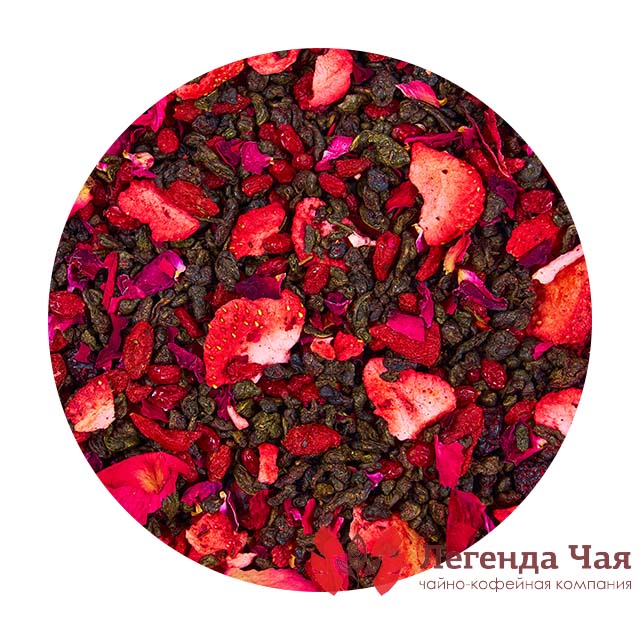 Китайский зеленый чай ганпаудер, барбарис красный, вишня сушеная, лепестки розы, мелкие лепестки розы, слайсы клубники, ягоды годжиРекомендуемые методы заваривания: