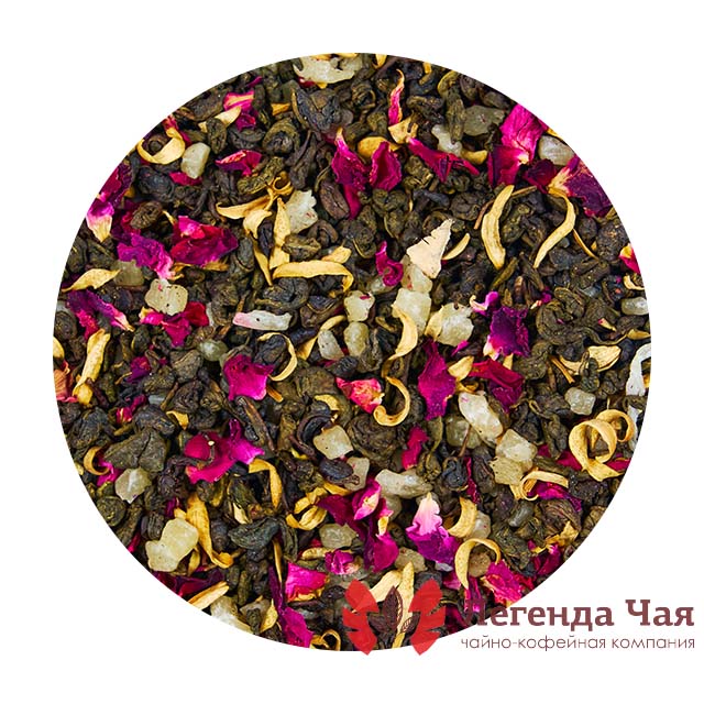 Китайский зеленый чай ганпаудер, мелкие лепестки розы, цветок апельсинового дерева, цукаты ананаса светлые, цукаты мангоРекомендуемые методы заваривания: