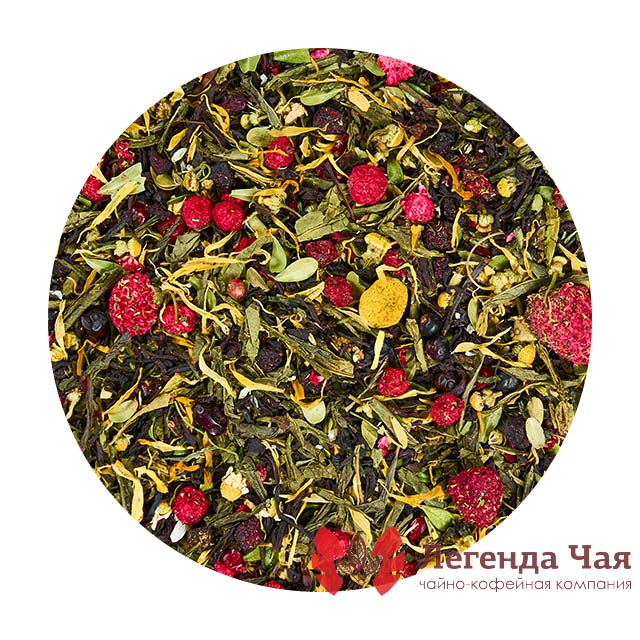 Кенийский черный чай, Китайский зеленый чай Сенча, барбарис красный, вишня сушеная, ежевика, листья толокнянки, малина сублимированная, можжевельник, ромашка, смородина красная, цветок календулы